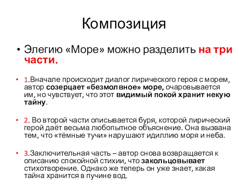 3.Заключительная часть – автор снова возвращается к описанию спокойной стихии, что закольцовывает стихотворение. Однако же теперь он уже знает, какая тайна хранится в пучине вод.