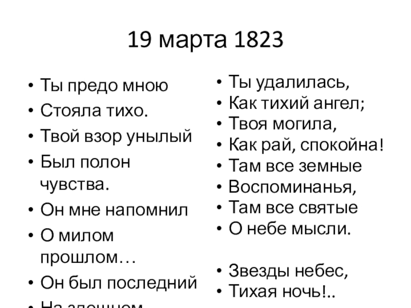 На смерть Марии он написал стихотворение («Ты предо мною стояла тихо…»), позднее названное «19 марта 1823».