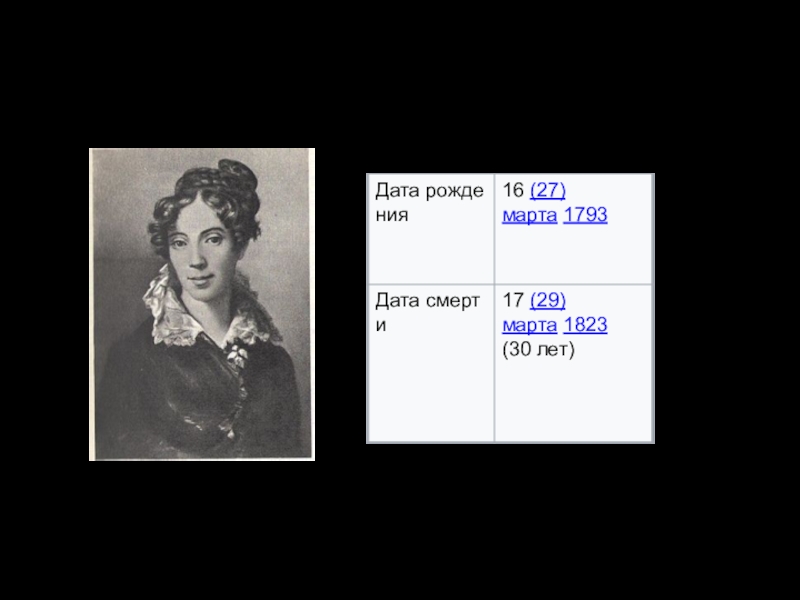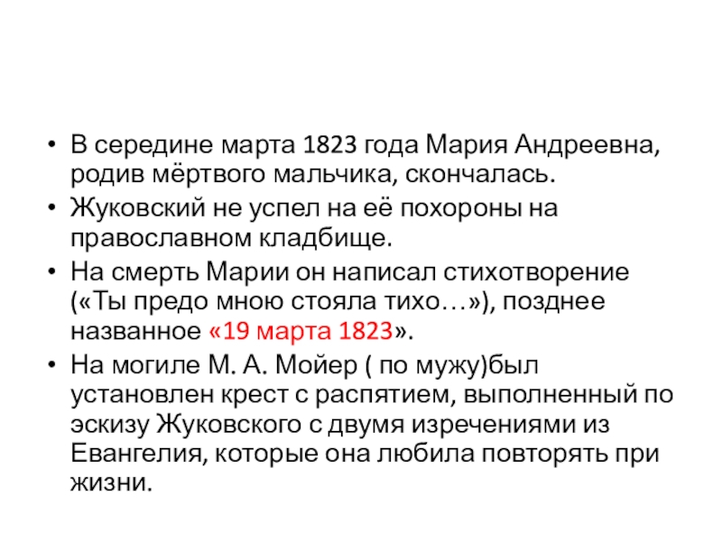 Слайд 9В середине марта 1823 года Мария Андреевна, родив мёртвого мальчика, скончалась.