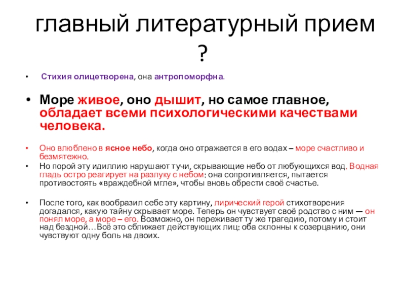 с морем, автор созерцает «безмолвное» море, очаровывается им, но чувствует, что этот видимый покой хранит некую тайну.
