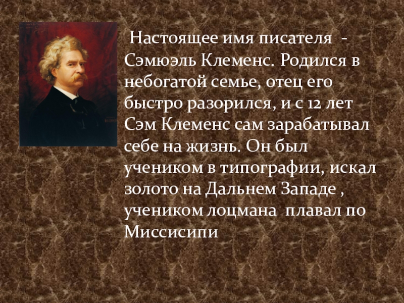Слайд 3 Настоящее имя писателя - Сэмюэль Клеменс. Родился в небогатой семье,