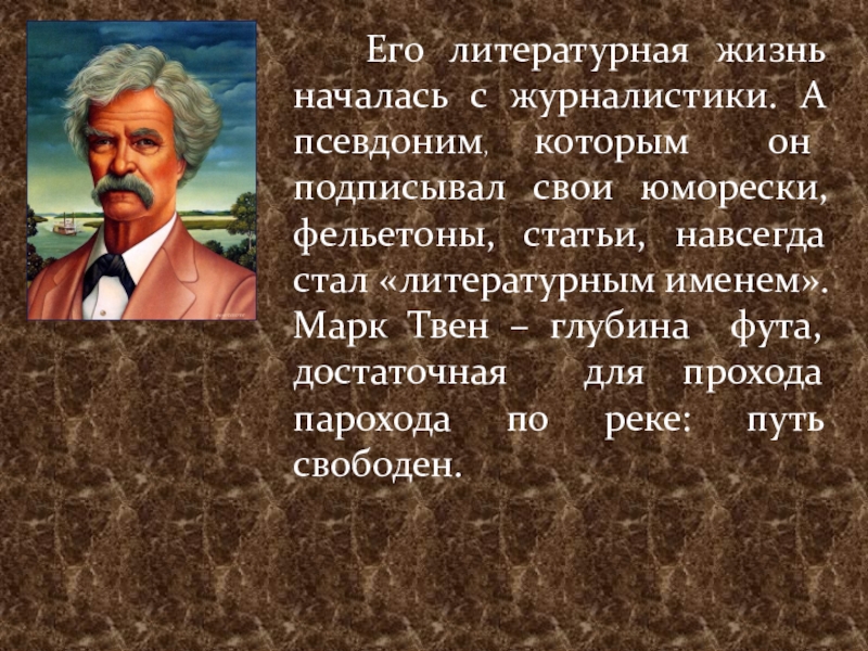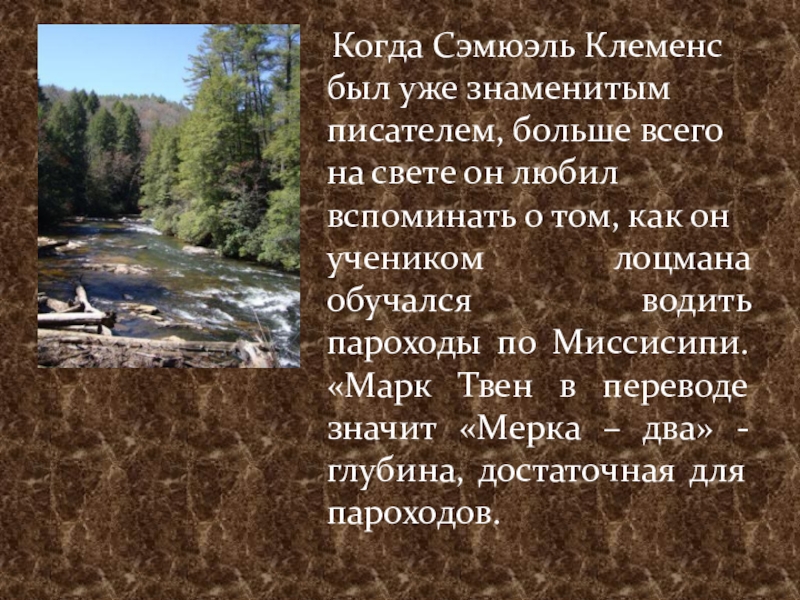 учеником лоцмана обучался водить пароходы по Миссисипи. «Марк Твен в переводе значит «Мерка – два» - глубина, достаточная для пароходов.