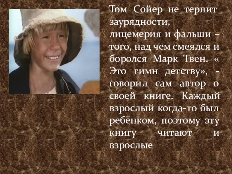 Слайд 7Том Сойер не терпит заурядности, лицемерия и фальши – того, над
