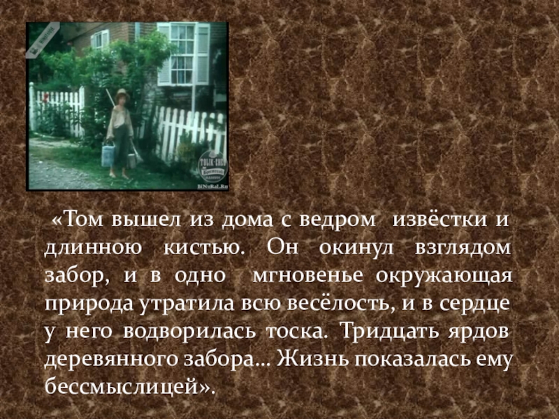 Слайд 9 «Том вышел из дома с ведром извёстки и длинною кистью.
