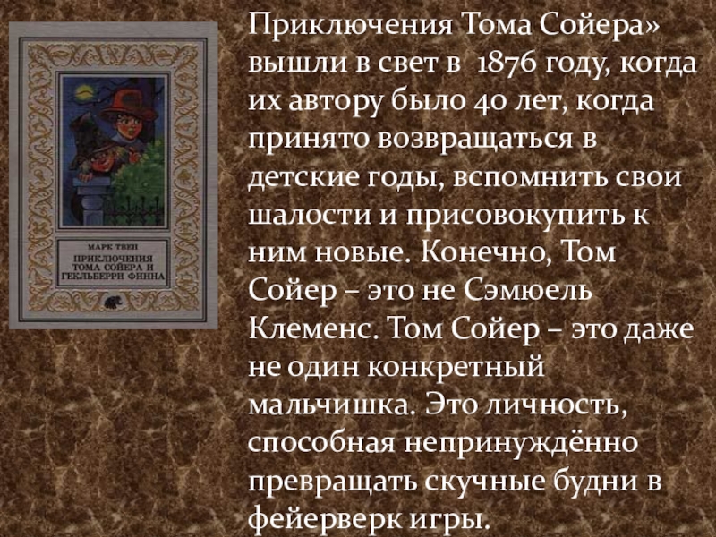автору было 40 лет, когда принято возвращаться в детские годы, вспомнить свои шалости и присовокупить к ним новые. Конечно, Том Сойер – это не Сэмюель Клеменс. Том Сойер – это даже не один конкретный мальчишка. Это личность, способная непринуждённо превращать скучные будни в фейерверк игры.