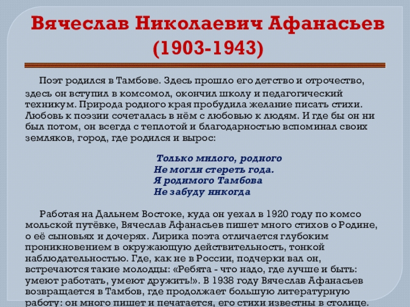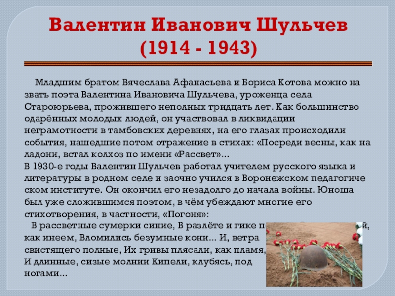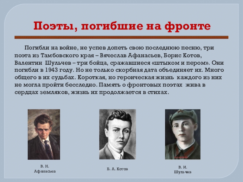 допеть свою последнюю песню, три поэта из Тамбовского края – Вячеслав Афанасьев, Борис Котов, Валентин Шульчев – три бойца, сражавшиеся «штыком и пером». Они погибли в 1943 году. Но не только скорбная дата объединяет их. Много общего в их судьбах. Короткая, но героическая жизнь каждого из них не могла пройти бесследно. Память о фронтовых поэтах жива в сердцах земляков, жизнь их продолжается в стихах.