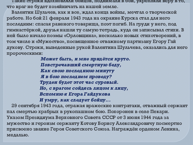 Валентин Шульчев, как и все, ждал конца войны, мечтал о творческой работе. Но бой 21 февраля 1943 года на окраине Курска стал для него последним: спасая раненого товарища, поэт погиб. На груди у него, под гимнастёркой, друзья нашли ту самую тетрадь, куда он записывал стихи. В ней было начало поэмы «Орловщина», несколько новых стихотворений, в том числе и «Мужество», посвященное отважному партизану Егору Гайдукову. Строки, выведенные рукой Валентина Шульчева, оказались для него пророческими: