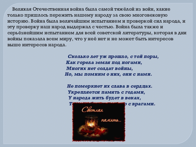 только пришлось пережить нашему народу за свою многовековую историю. Война была величайшим испытанием и проверкой сил народа, и эту проверку наш народ выдержал с честью. Война была также и серьёзнейшим испытанием для всей советской литературы, которая в дни войны показала всем миру, что у неё нет и не может быть интересов выше интересов народа.