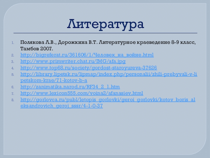 Полякова Л.В., Дорожкина В.Т. Литературное краеведение 8-9 класс, Тамбов 2007.
