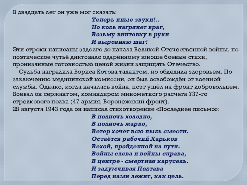 Эти строки написаны задолго до начала Великой Отечественной войны, но поэтическое чутьё диктовало одарённому юноше боевые стихи, пронизанные готовностью ценой жизни защищать Отечество.