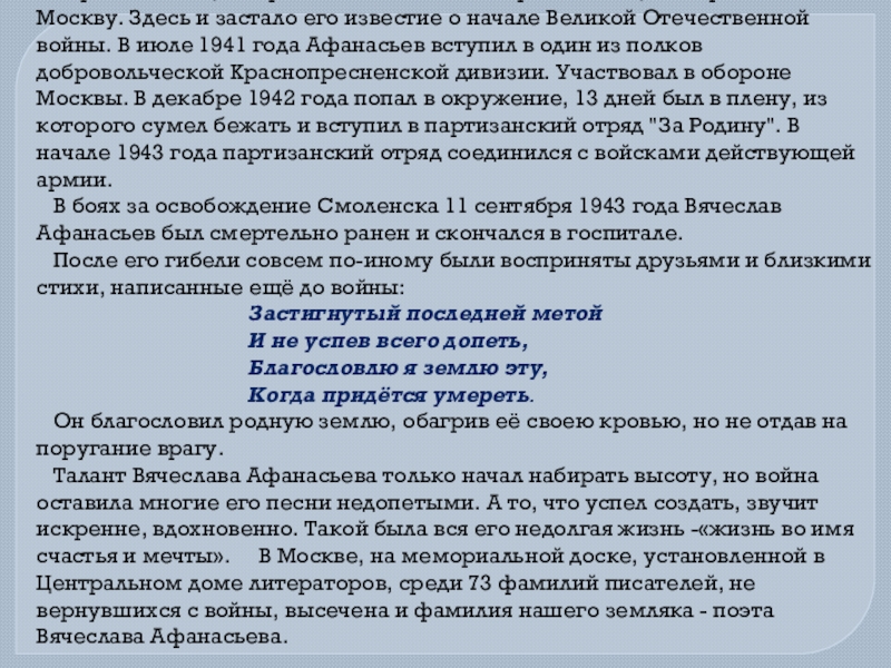 Талант Вячеслава Афанасьева только начал набирать высоту, но война оставила многие его песни недопетыми. А то, что успел создать, звучит искренне, вдохновенно. Такой была вся его недолгая жизнь -«жизнь во имя счастья и мечты». В Москве, на мемориальной доске, установленной в Центральном доме литераторов, среди 73 фамилий писателей, не вернувшихся с войны, высечена и фамилия нашего земляка - поэта Вячеслава Афанасьева.