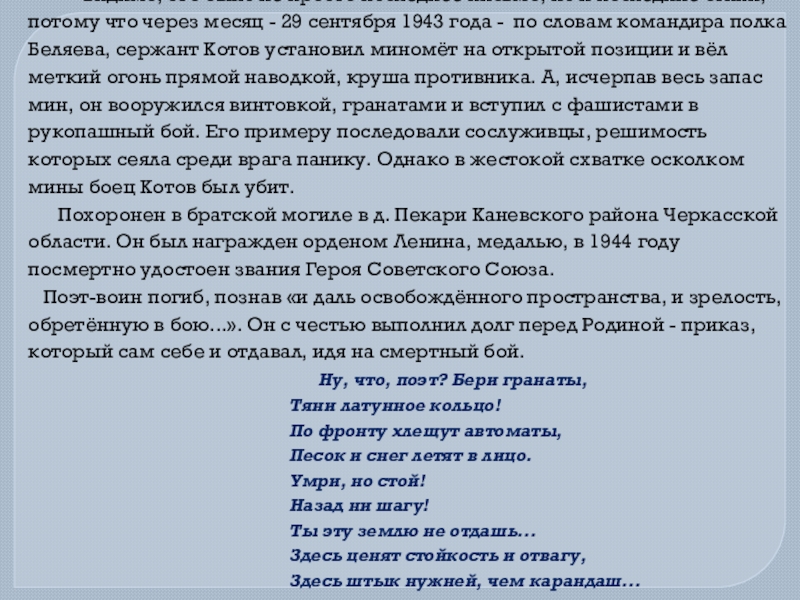 не просто последнее письмо, но и последние стихи, потому что через месяц - 29 сентября 1943 года - по словам командира полка Беляева, сержант Котов установил миномёт на открытой позиции и вёл меткий огонь прямой наводкой, круша противника. А, исчерпав весь запас мин, он вооружился винтовкой, гранатами и вступил с фашистами в рукопашный бой. Его примеру последовали сослуживцы, решимость которых сеяла среди врага панику. Однако в жестокой схватке осколком мины боец Котов был убит.
