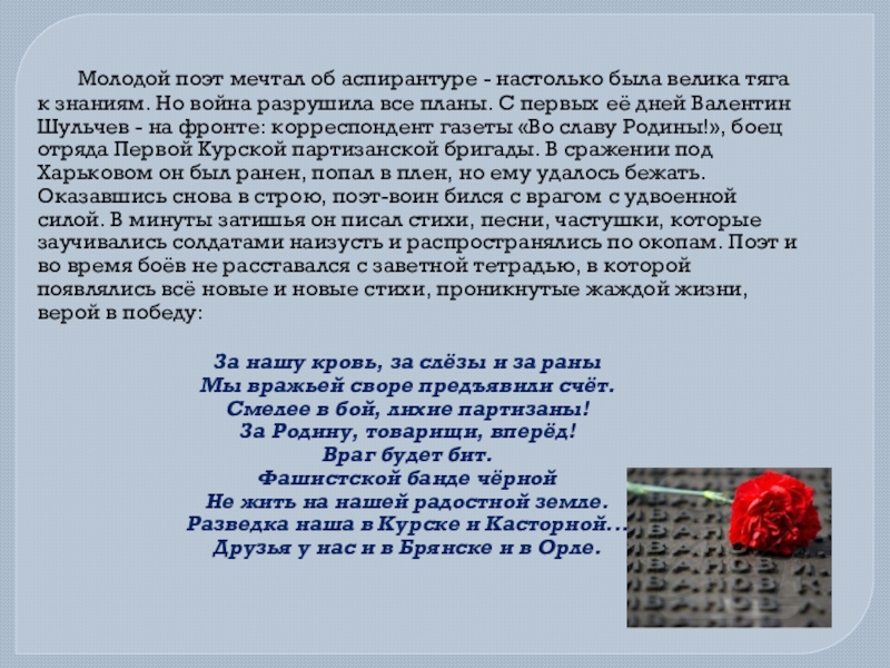 - настолько была велика тяга к знаниям. Но война разрушила все планы. С первых её дней Валентин Шульчев - на фронте: корреспондент газеты «Во славу Родины!», боец отряда Первой Курской партизанской бригады. В сражении под Харьковом он был ранен, попал в плен, но ему удалось бежать. Оказавшись снова в строю, поэт-воин бился с врагом с удвоенной силой. В минуты затишья он писал стихи, песни, частушки, которые заучивались солдатами наизусть и распространялись по окопам. Поэт и во время боёв не расставался с заветной тетрадью, в которой появлялись всё новые и новые стихи, проникнутые жаждой жизни, верой в победу: