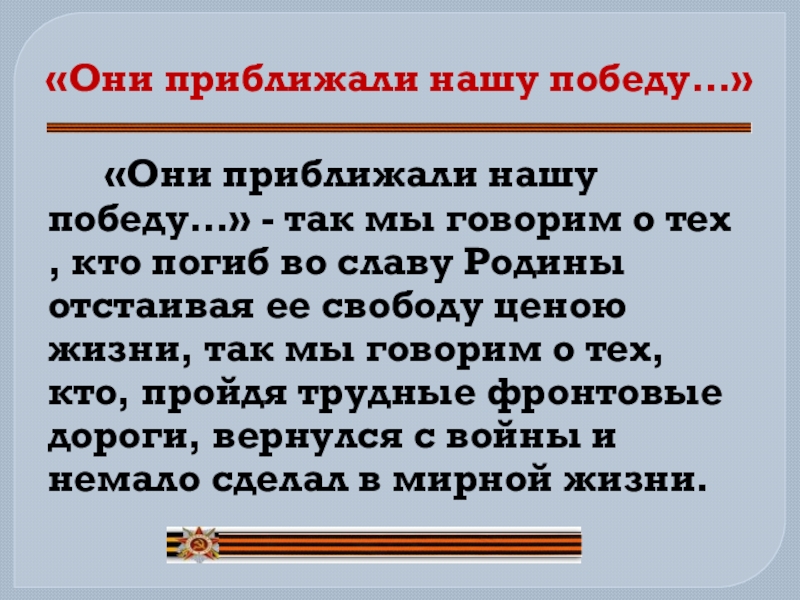 - так мы говорим о тех , кто погиб во славу Родины отстаивая ее свободу ценою жизни, так мы говорим о тех, кто, пройдя трудные фронтовые дороги, вернулся с войны и немало сделал в мирной жизни.