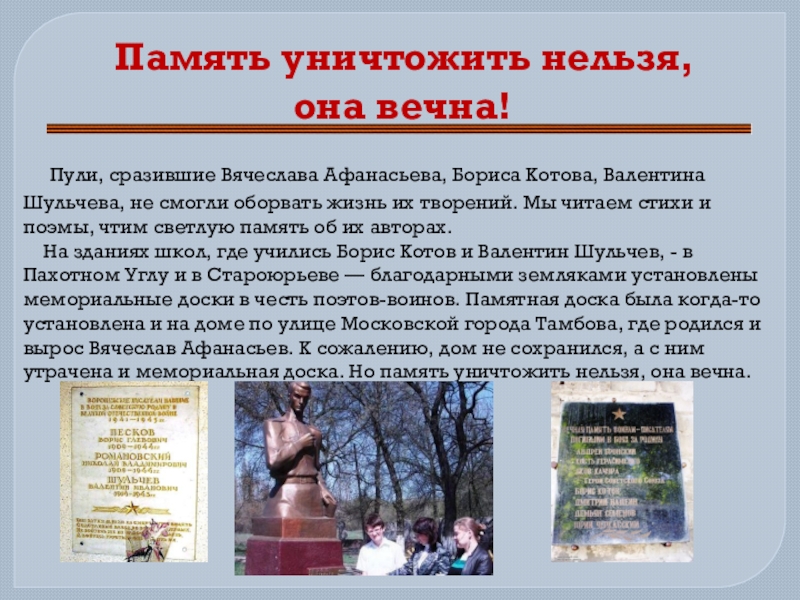 На зданиях школ, где учились Борис Котов и Валентин Шульчев, - в Пахотном Углу и в Староюрьеве — благодарными земляками установлены мемориальные доски в честь поэтов-воинов. Памятная доска была когда-то установлена и на доме по улице Московской города Тамбова, где родился и вырос Вячеслав Афанасьев. К сожалению, дом не сохранился, а с ним утрачена и мемориальная доска. Но память уничтожить нельзя, она вечна.