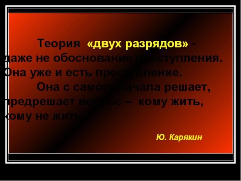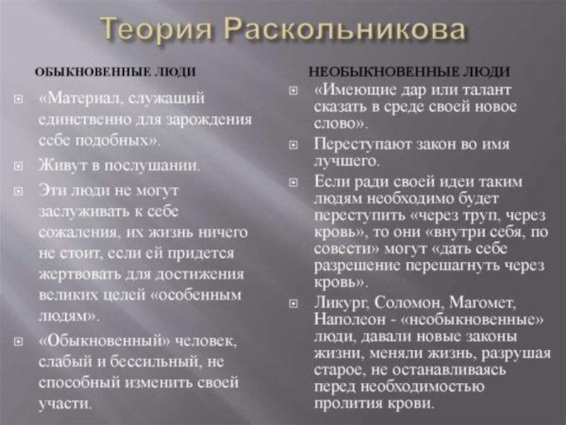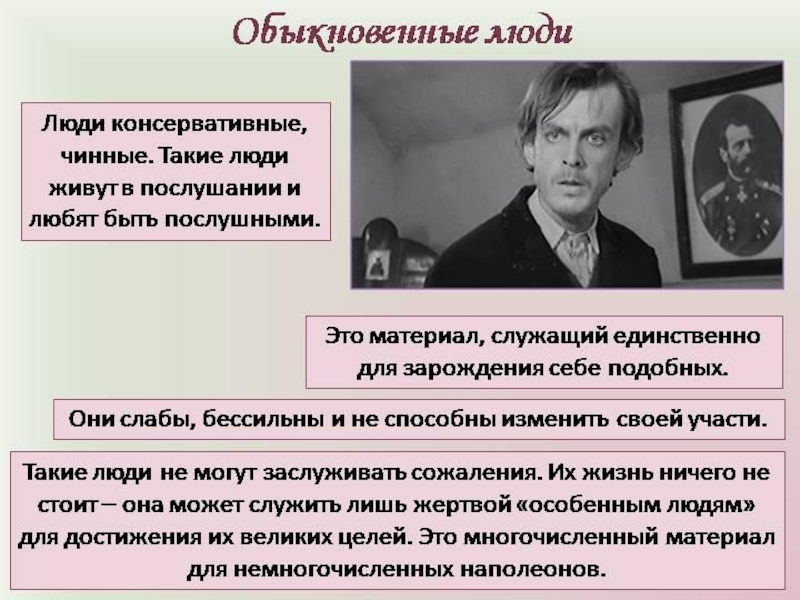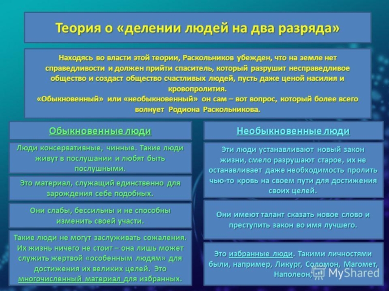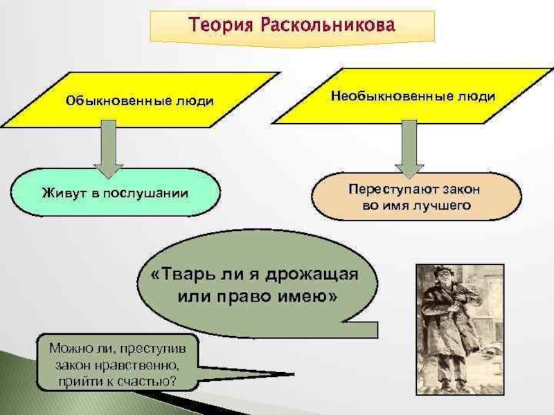 дело в том, что в ихней статье все люди как-то разделяются на «обыкновенных» и «необыкновенных». Обыкновенные должны жить в послушании и не имеют права переступать закона, потому что они, видите ли, обыкновенные. А необыкновенные имеют право делать всякие преступления и всячески преступать закон, собственно потому, что они необыкновенные. Так у вас, кажется, если только не ошибаюсь?