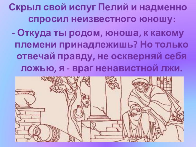 Слайд 11Скрыл свой испуг Пелий и надменно спросил неизвестного юношу:
