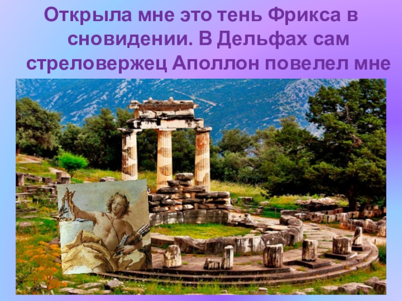 Слайд 23Открыла мне это тень Фрикса в сновидении. В Дельфах сам стреловержец