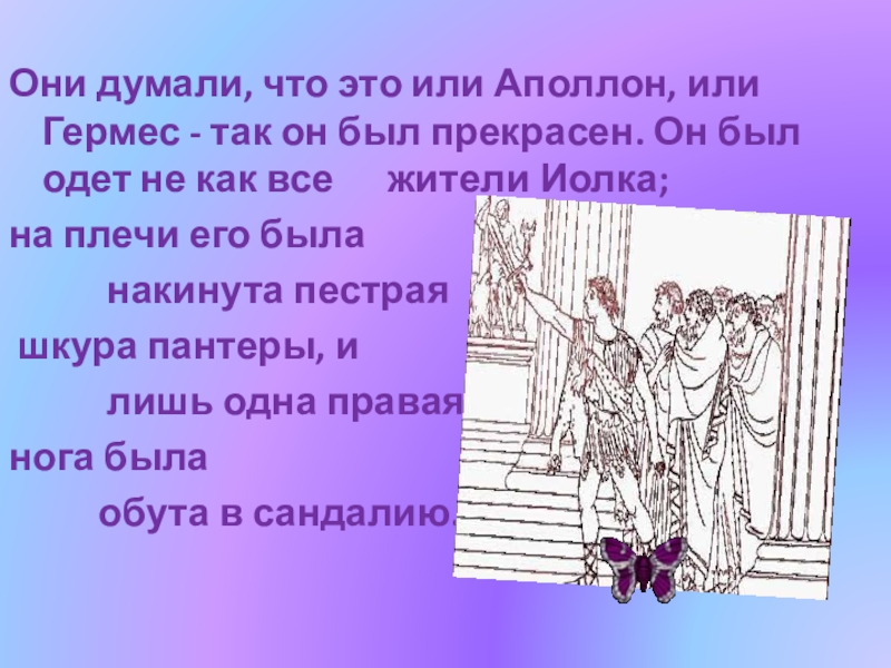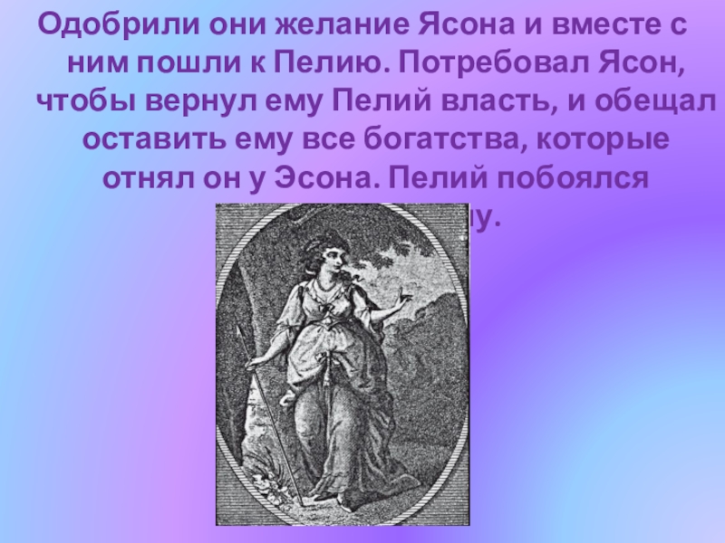 Слайд 20Одобрили они желание Ясона и вместе с ним пошли к Пелию.