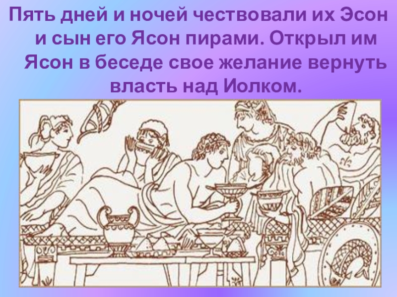 Слайд 19Пять дней и ночей чествовали их Эсон и сын его Ясон