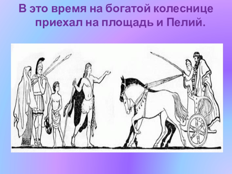 Слайд 6В это время на богатой колеснице приехал на площадь и Пелий.