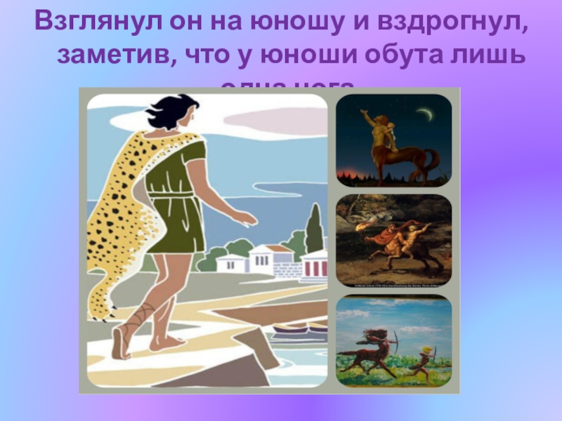 Слайд 7Взглянул он на юношу и вздрогнул, заметив, что у юноши обута