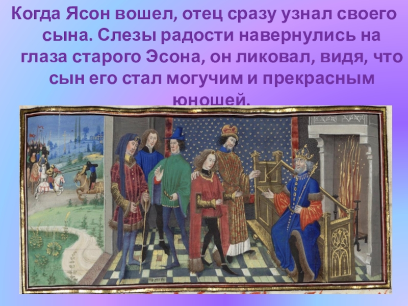 Слайд 16Когда Ясон вошел, отец сразу узнал своего сына. Слезы радости навернулись
