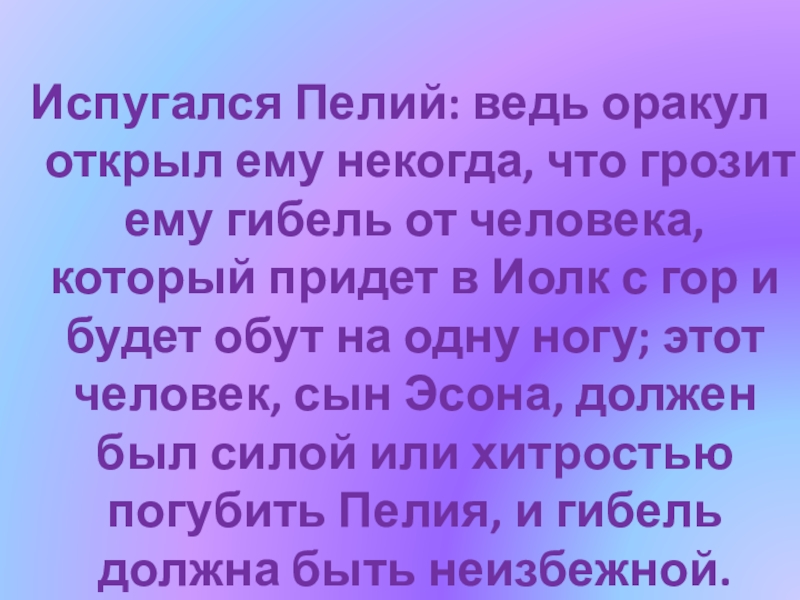от человека, который придет в Иолк с гор и будет обут на одну ногу; этот человек, сын Эсона, должен был силой или хитростью погубить Пелия, и гибель должна быть неизбежной.