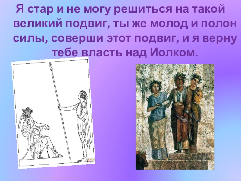 же молод и полон силы, соверши этот подвиг, и я верну тебе власть над Иолком.