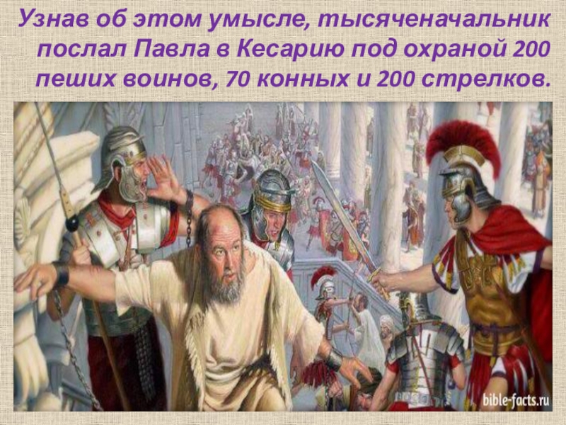 Слайд 7Узнав об этом умысле, тысяченачальник послал Павла в Кесарию под охраной