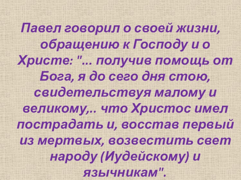 "... получив помощь от Бога, я до сего дня стою, свидетельствуя малому и великому,.. что Христос имел пострадать и, восстав первый из мертвых, возвестить свет народу (Иудейскому) и язычникам".