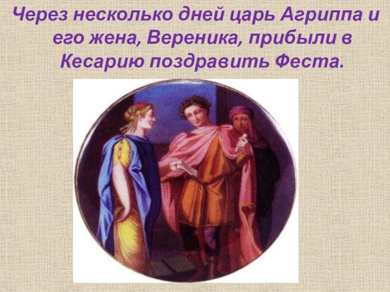 Слайд 18Через несколько дней царь Агриппа и его жена, Вереника, прибыли в