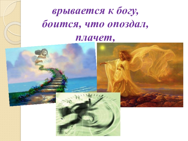 Слайд 9врывается к богу, боится, что опоздал, плачет,