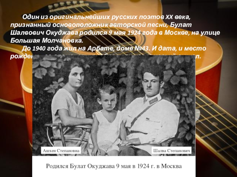Булат Шалвович Окуджава родился 9 мая 1924 года в Москве, на улице Большая Молчановка.