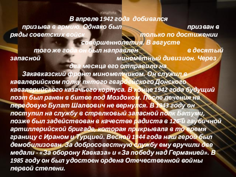 Слайд 7 В апреле 1942 года добивался призыва в армию. Однако был