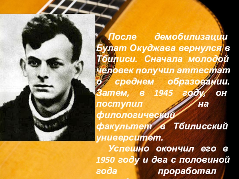 Слайд 8 После демобилизации Булат Окуджава вернулся в Тбилиси. Сначала молодой человек получил