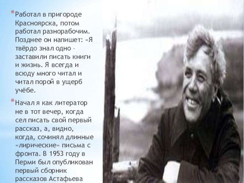 ВойнаРаботал в пригороде Красноярска, потом работал разнорабочим. Позднее он напишет: «Я твёрдо знал одно – заставили писать
