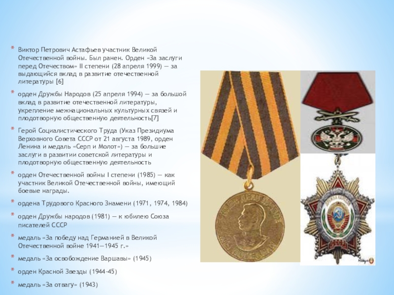 НаградыВиктор Петрович Астафьев участник Великой Отечественной войны. Был ранен. Орден «За заслуги перед Отечеством» II степени (28