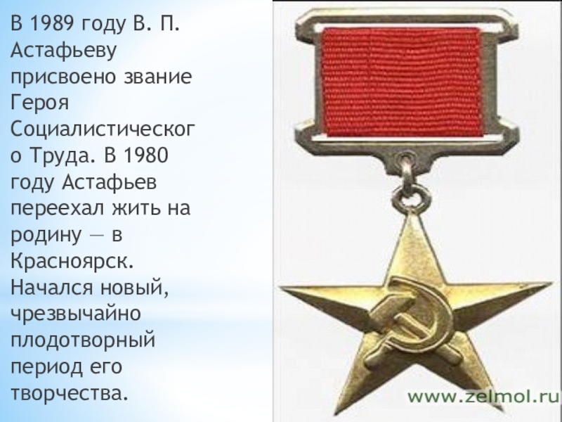 Слайд 5В 1989 году В. П. Астафьеву присвоено звание Героя Социалистического Труда.