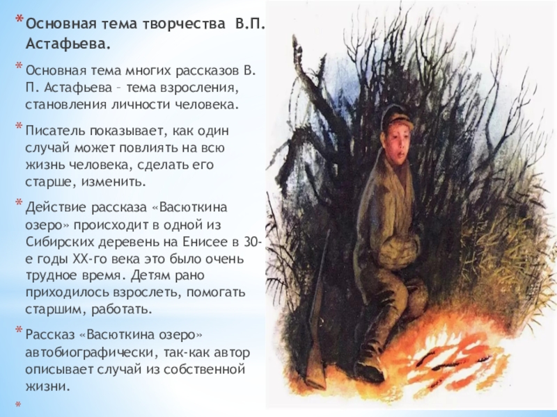 Основная тема творчества В.П. Астафьева.Основная тема многих рассказов В.П. Астафьева – тема взросления, становления личности человека.Писатель показывает,