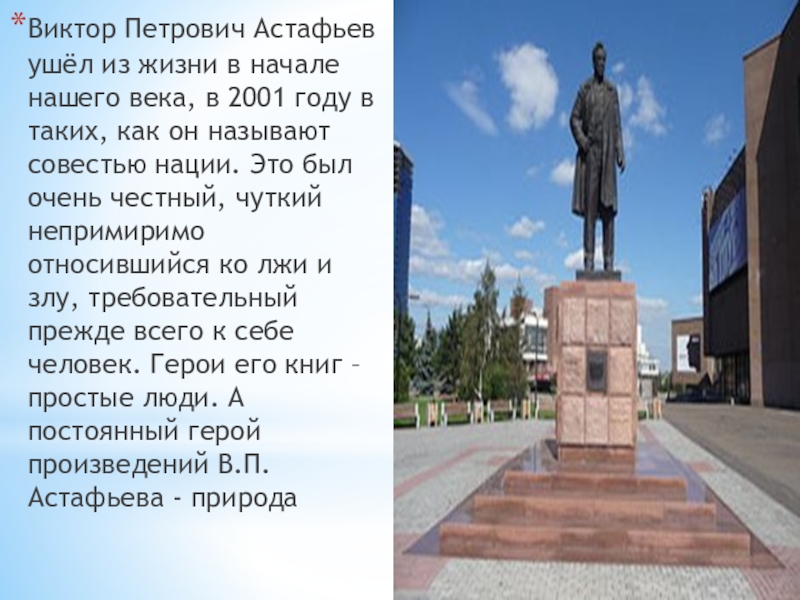 Слайд 7Виктор Петрович Астафьев ушёл из жизни в начале нашего века, в