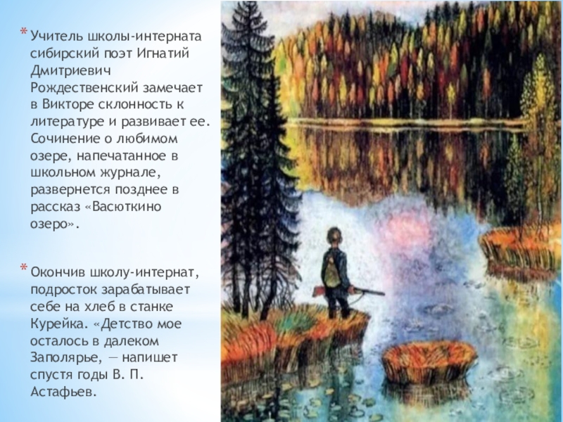 Учитель школы-интерната сибирский поэт Игнатий Дмитриевич Рождественский замечает в Викторе склонность к литературе и развивает ее. Сочинение
