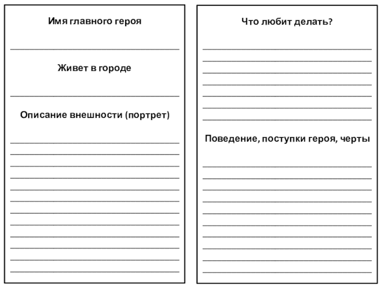 Имя главного героя ___________________________________Живет в городе ___________________________________Описание внешности (портрет)____________________________________________________________________________________________________________________________________________________________________________________________________________________________________________________________________________________________________________________________________________________________________________________________________________________________________Что любит делать?_____________________________________________________________________________________________________________________________________________________________________________________________________________________________________________________Поведение, поступки героя, черты______________________________________________________________________________________________________________________________________________________________________________________________________________________________________________________________________________________________________________________________________________________________