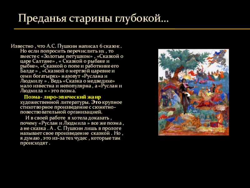 И в своей работе я хотела доказать , почему «Руслан и Людмила » все же поэма , а не сказка . А . С. Пушкин лишь в прологе называет свое произведение сказкой . Но , я думаю , это из-за тех чудес , которые там происходят .