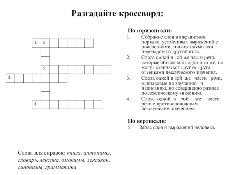 Слова для справок: книга, антонимы, словарь, лексика, омонимы, лексикон, синонимы, грамматика