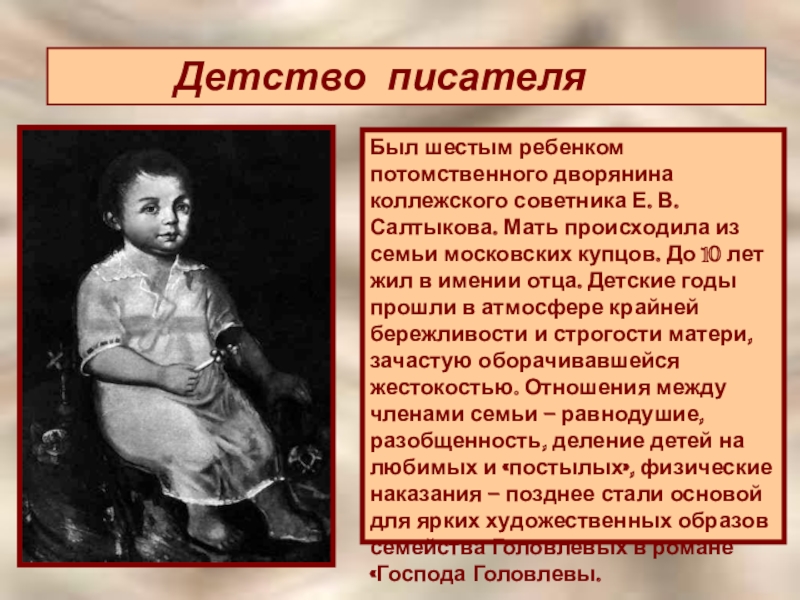 Салтыкова. Мать происходила из семьи московских купцов. До 10 лет жил в имении отца. Детские годы прошли в атмосфере крайней бережливости и строгости матери, зачастую оборачивавшейся жестокостью. Отношения между членами семьи – равнодушие, разобщенность, деление детей на любимых и «постылых», физические наказания – позднее стали основой для ярких художественных образов семейства Головлевых в романе «Господа Головлевы.