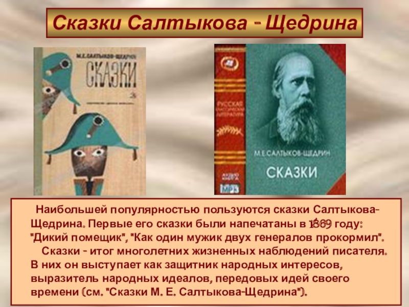 Наибольшей популярностью пользуются сказки Салтыкова-Щедрина. Первые его сказки