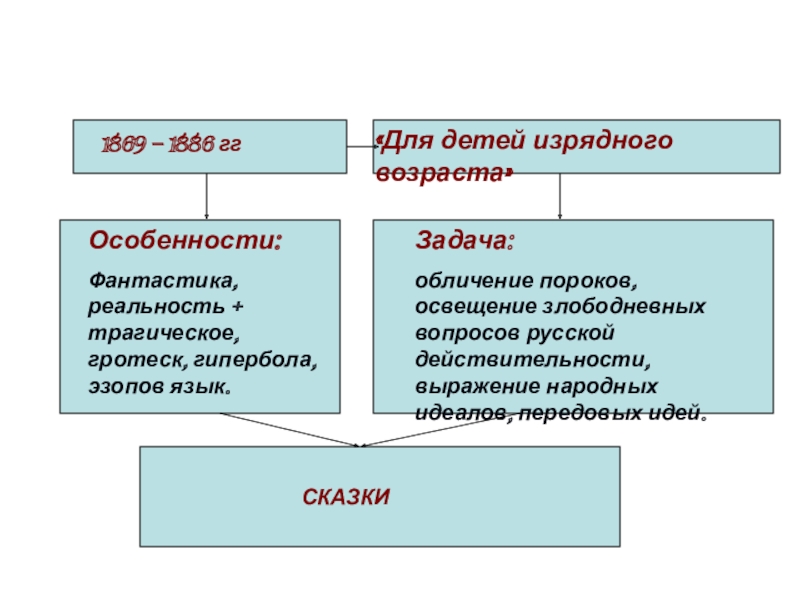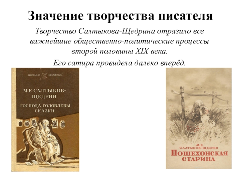 Сказки - итог многолетних жизненных наблюдений писателя. В них он выступает как защитник народных интересов, выразитель народных идеалов, передовых идей своего времени (см. "Сказки М. Е. Салтыкова-Щедрина").