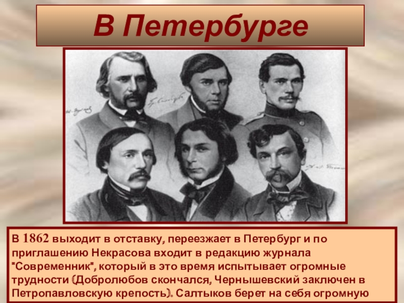 приглашению Некрасова входит в редакцию журнала "Современник", который в это время испытывает огромные трудности (Добролюбов скончался, Чернышевский заключен в Петропавловскую крепость). Салтыков берет на себя огромную писательскую и редакторскую работу.