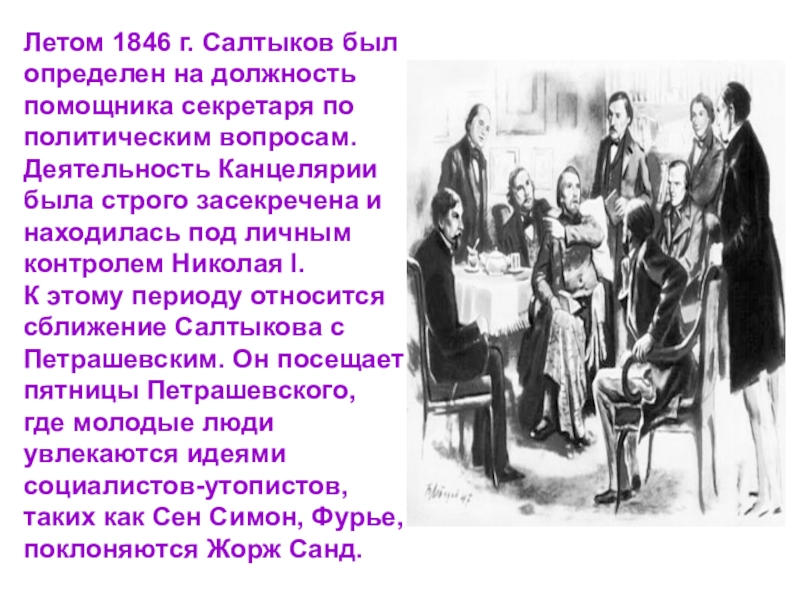 К этому периоду относится сближение Салтыкова с Петрашевским. Он посещает пятницы Петрашевского, где молодые люди увлекаются идеями социалистов-утопистов, таких как Сен Симон, Фурье, поклоняются Жорж Санд.